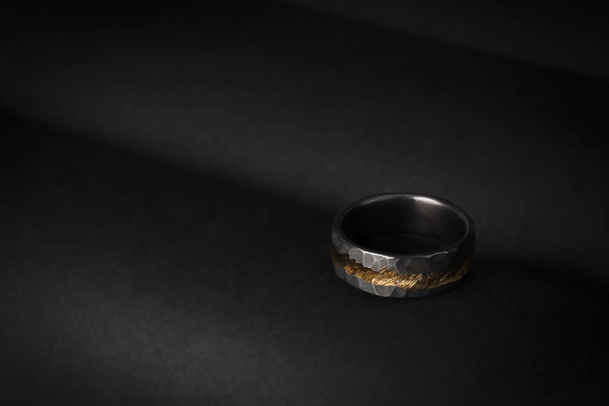 For this shoot, I chose a dark, textured background to enhance the contrast between the metals and create a dramatic, moody aesthetic. The black stones provide a natural, earthy foundation that complements the rustic finish of the rings while allowing the gold tones to stand out.