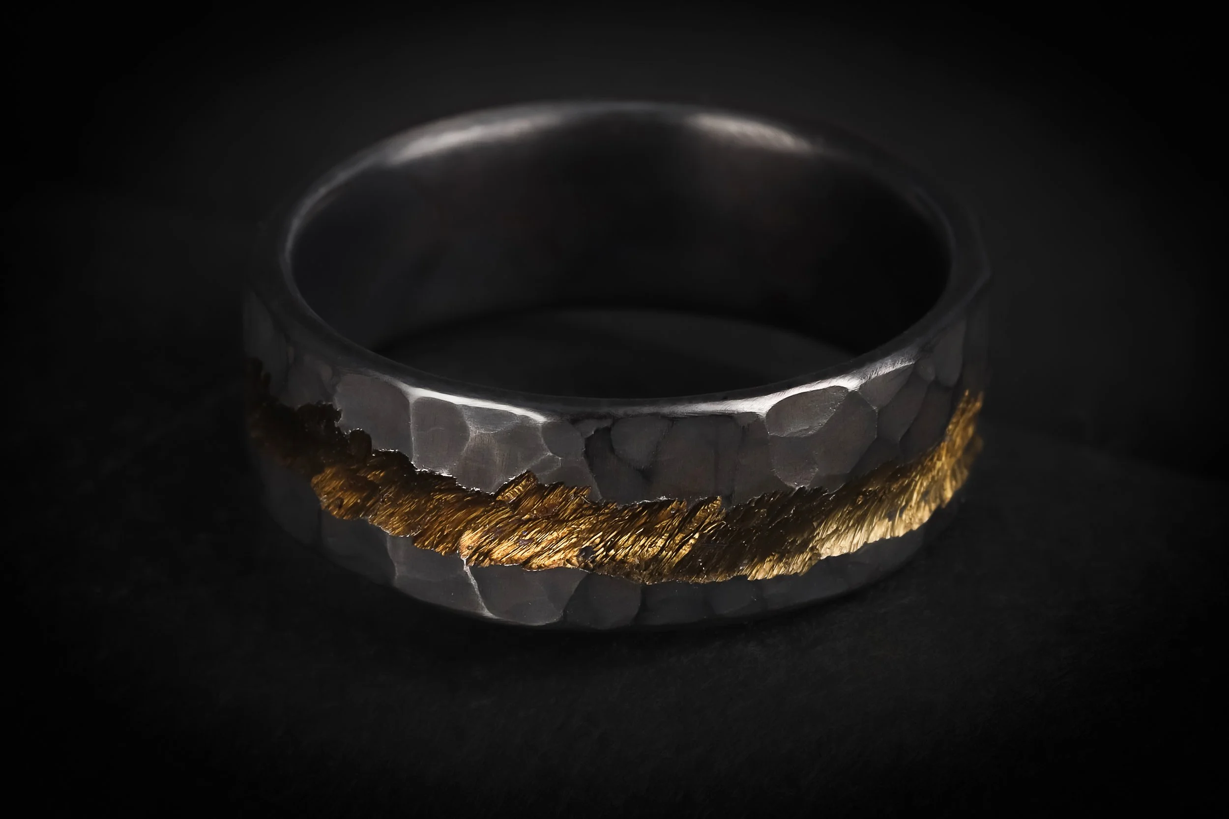These rings stand out immediately due to their distinctive design. One band features a hammered, matte finish with a raw, organic texture, contrasted by a bold streak of polished gold running through its center. The second ring complements it beautifully with a faceted, hammered gold exterior that reflects light in a subtle yet captivating way.